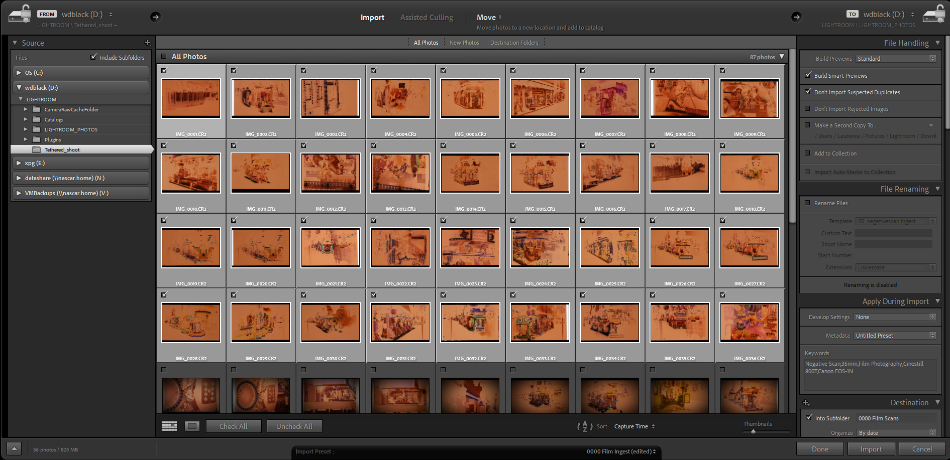 lightroom – full import dialog with source, selection of one film, keyword and import settings, preset label